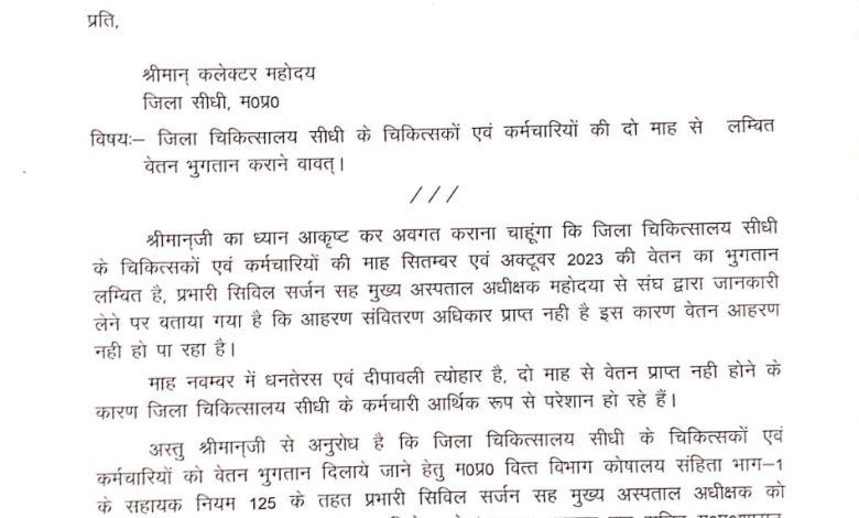 चिकित्सकों व स्वास्थ्य कर्मचारियों को 2 माह से नहीं मिल रहा वेतन, संघठन ने कलेक्टर से लगाई गुहार