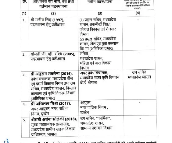 भोपाल। IAS अफसरों के तबादले को लेकर मध्य प्रदेश सरकार ने एक बार फिर बड़ा प्रशासनिक आदेश जारी किया है। इस बदलाव में जहां पांच वरिष्ठ अधिकारियों का ट्रांसफर किया गया है, वहीं चार अफसरों को अतिरिक्त जिम्मेदारियां सौंपी गई हैं। लंबे समय से पोस्टिंग का इंतजार कर रहे मनीष सिंह को आखिरकार अहम विभाग की कमान मिल गई है।