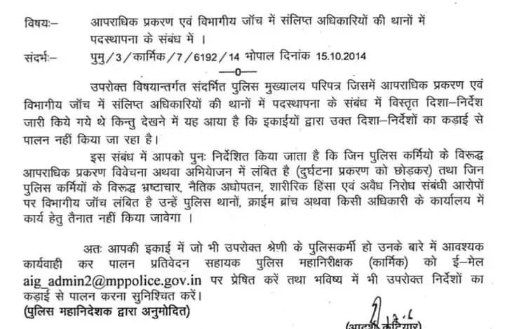 पुलिस मुख्यालय भोपाल ने सभी जिलों के पुलिस अधीक्षकों को यह निर्देश जारी किया है कि जिन अधिकारियों/कर्मचारियों पर आपराधिक प्रकरण दर्ज हैं या जिन पर विभागीय जांच लंबित है, उन्हें तत्काल थानों से हटाकर अन्यत्र पदस्थ किया जाए। इसके साथ ही अनुपालना रिपोर्ट भी मुख्यालय को भेजी जाए।