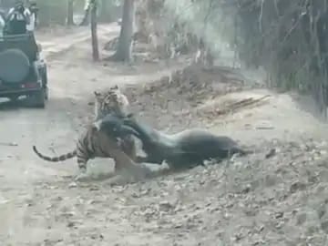 पर्यटकों के सामने बाघ ने किया बैल का शिकार, कैमरे में कैद हुआ नजारा